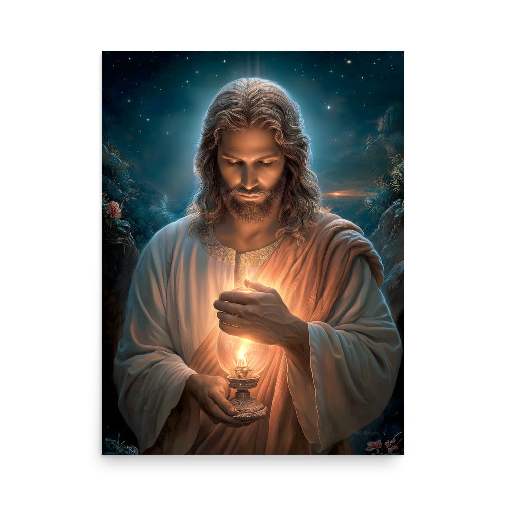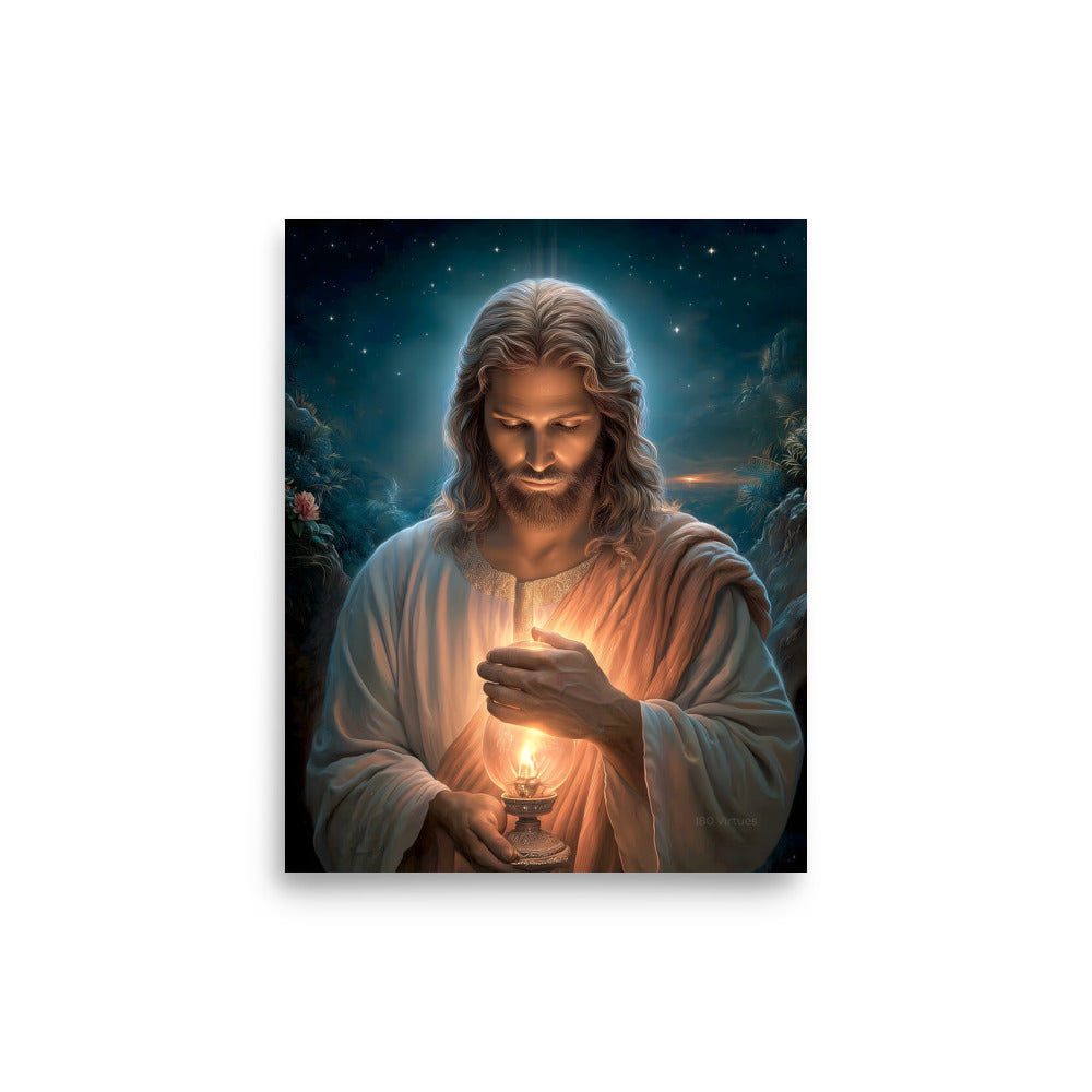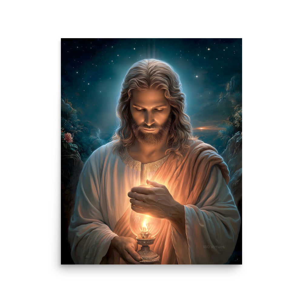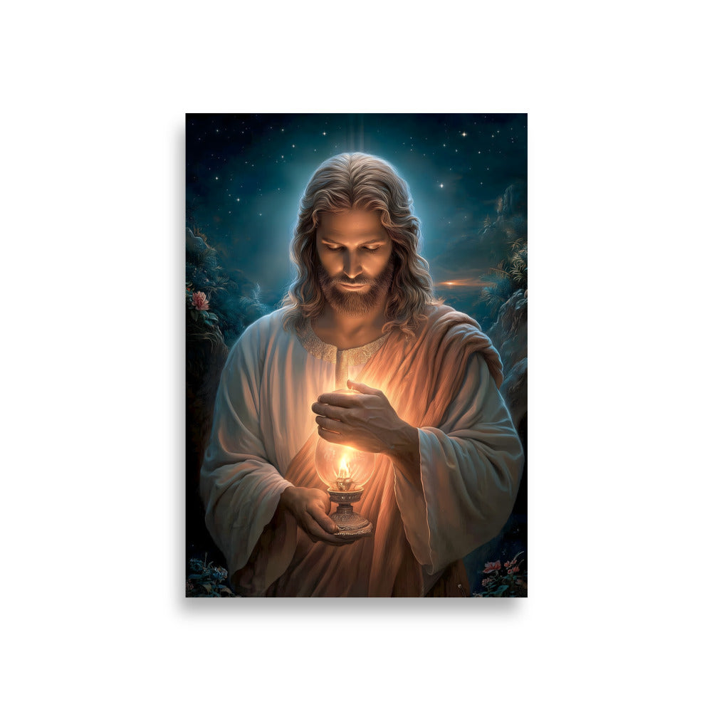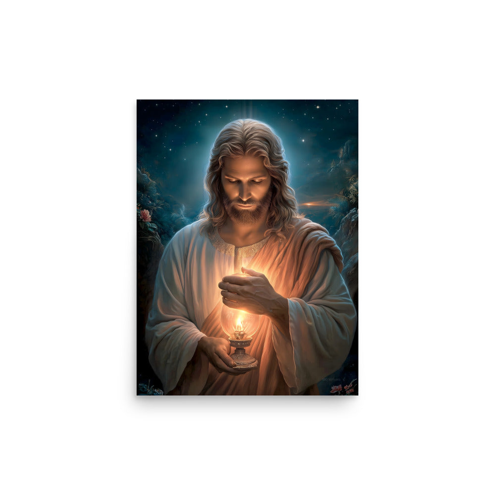 Invite calm, hope, and quiet assurance into your space with this radiant, museum-quality artwork portraying **Jesus Christ** as the Light of the World, gently illuminating the darkness with a steady, living flame. Beneath a star-filled night sky, Christ gazes downward in reverent stillness, His face softly aglow as He shields the lantern’s flame with tender care. The surrounding shadows recede before the warm light, symbolizing divine truth, mercy, and guidance that reaches even the most hidden corners of the heart.
