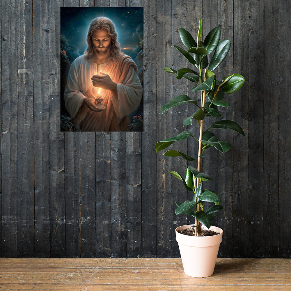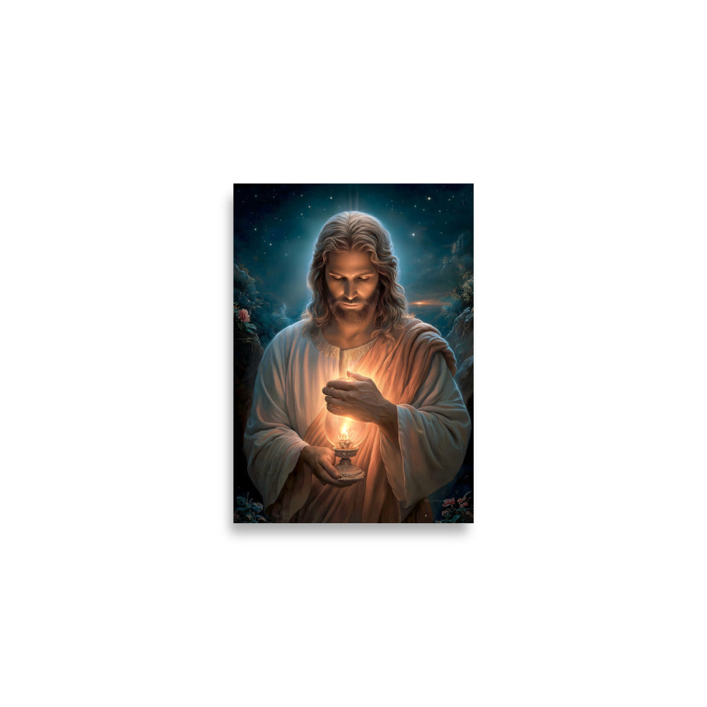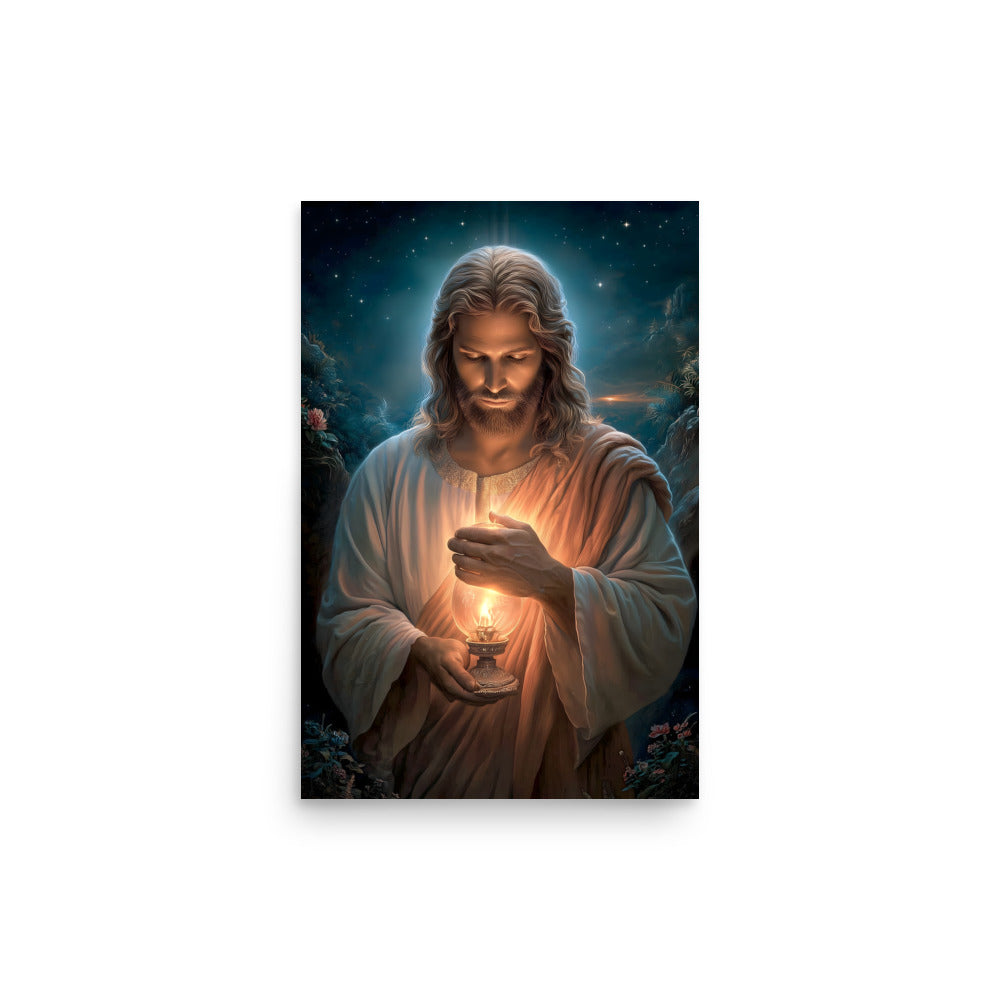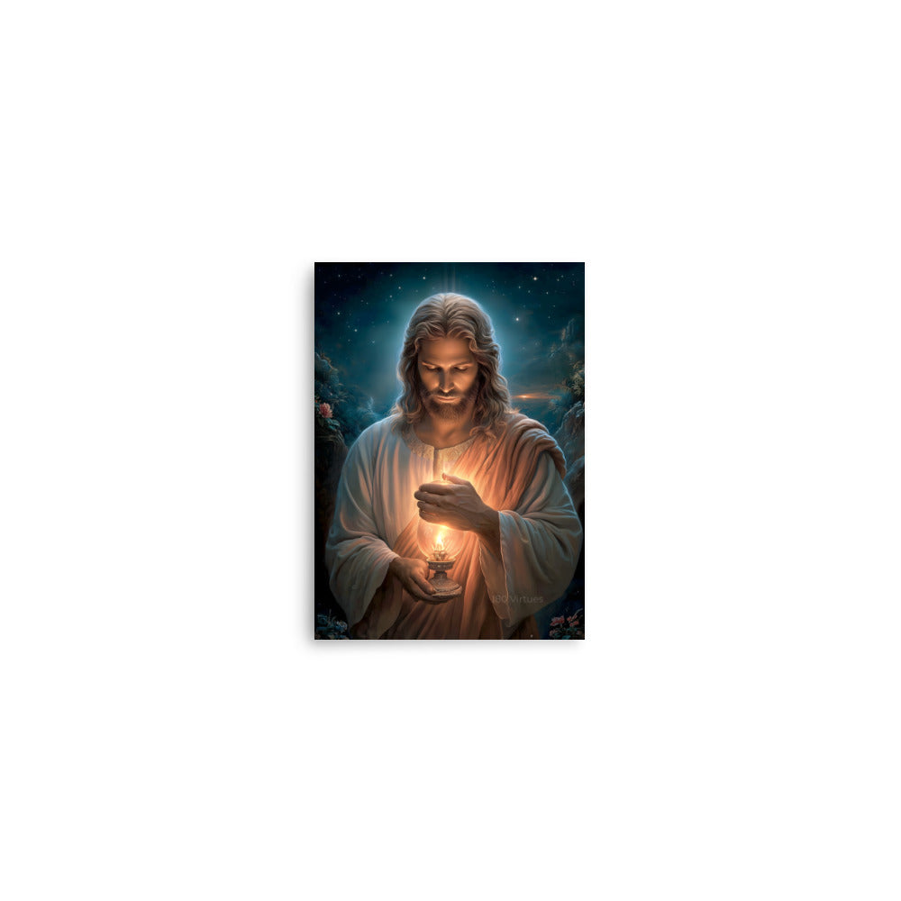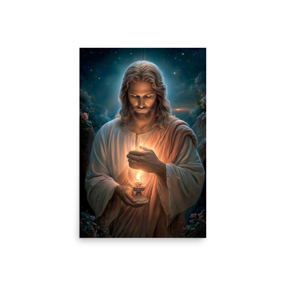 Invite calm, hope, and quiet assurance into your space with this radiant, museum-quality artwork portraying **Jesus Christ** as the Light of the World, gently illuminating the darkness with a steady, living flame. Beneath a star-filled night sky, Christ gazes downward in reverent stillness, His face softly aglow as He shields the lantern’s flame with tender care. The surrounding shadows recede before the warm light, symbolizing divine truth, mercy, and guidance that reaches even the most hidden corners of the heart.
