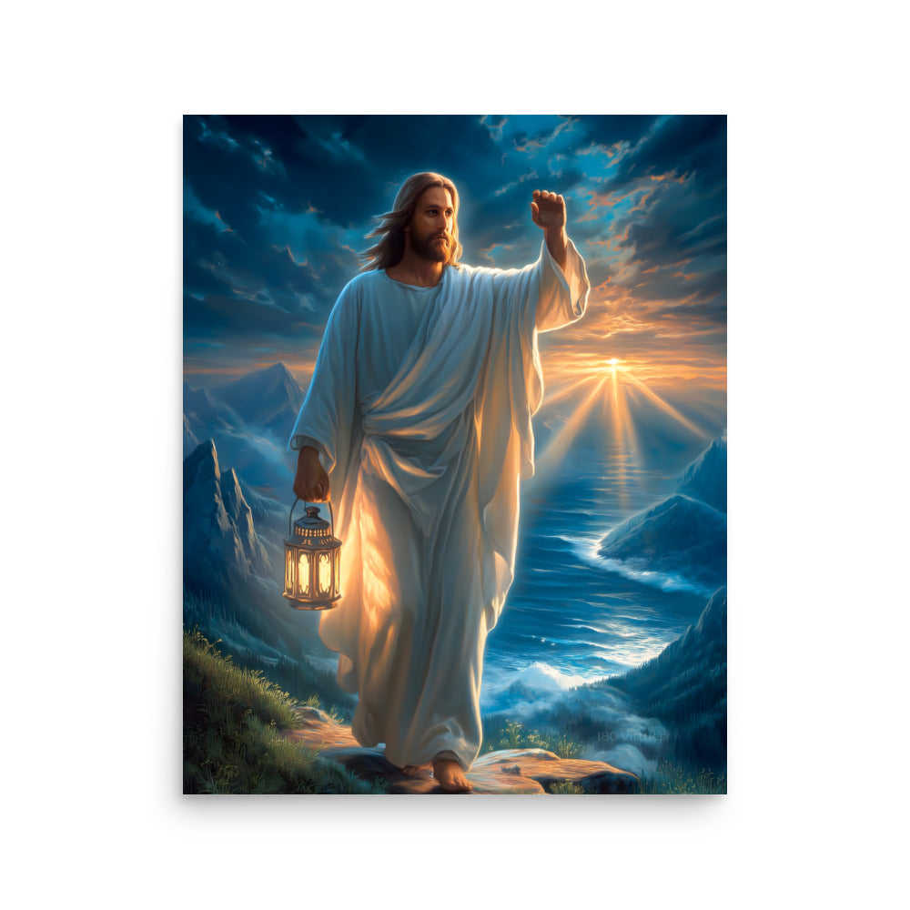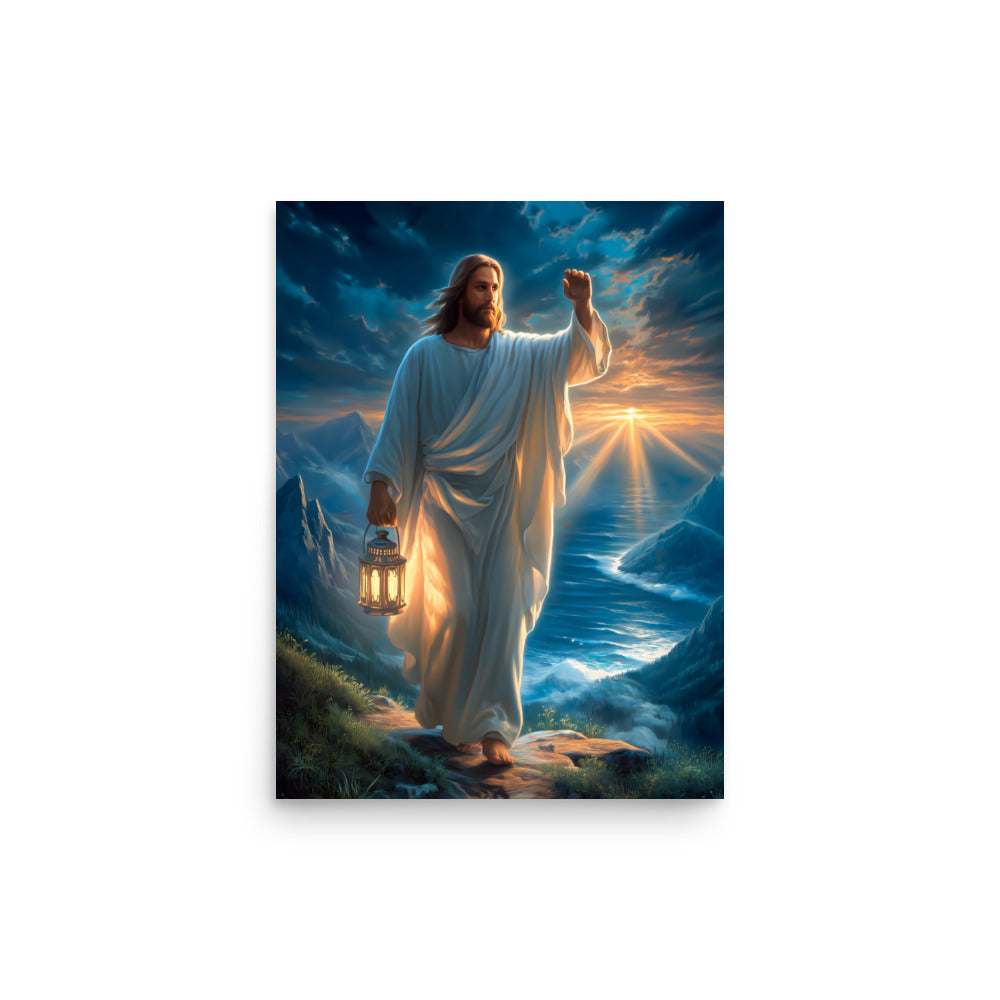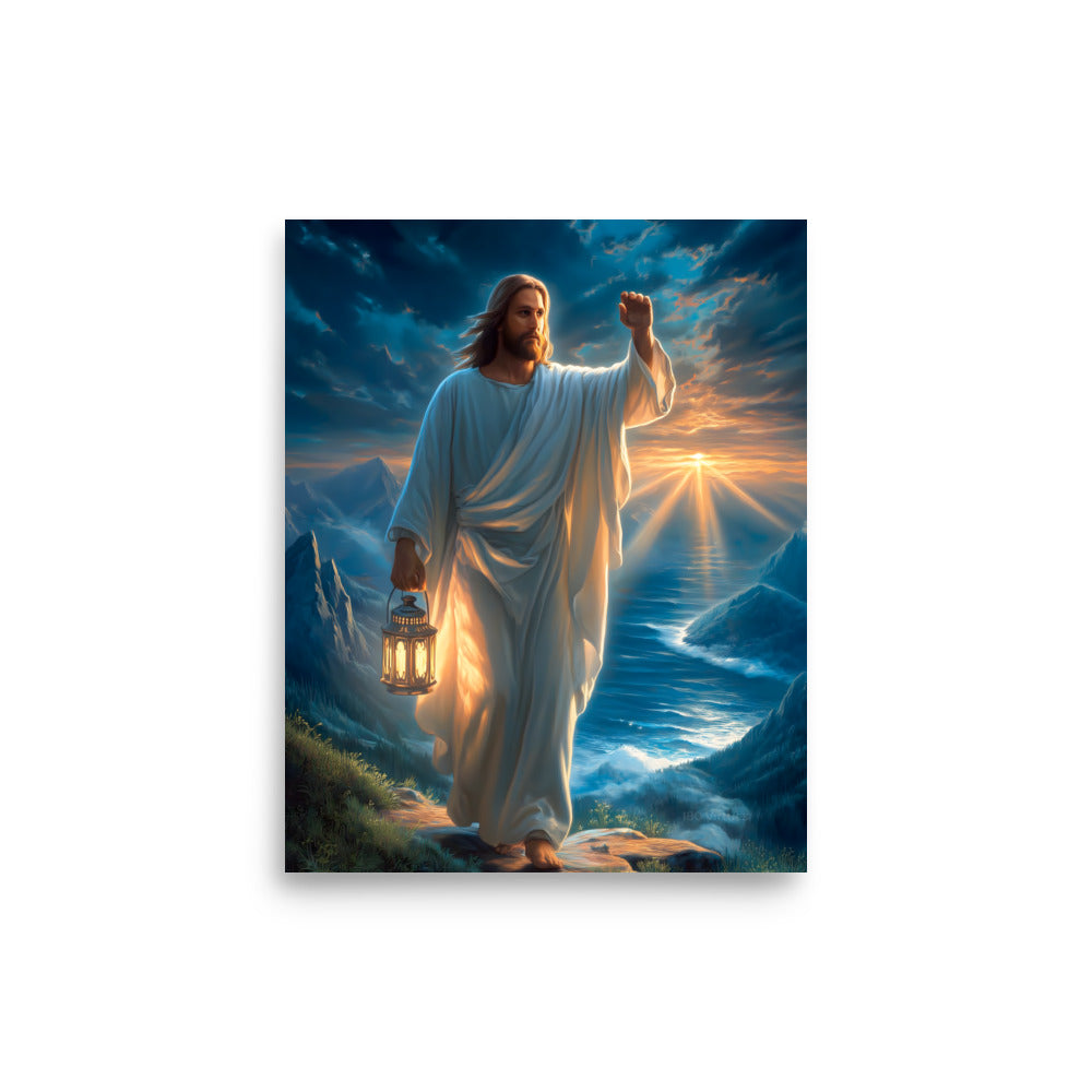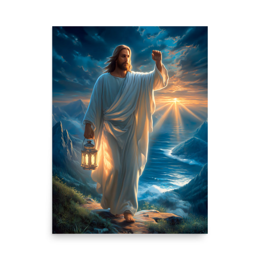 Bring courage, guidance, and steadfast hope into your space with this radiant, museum-quality artwork portraying Jesus Christ as the Light of the World, walking forward along a rugged mountain path as dawn breaks across the sea. In one hand He carries a glowing lantern, its warm light illuminating each step ahead, while His other hand is raised with calm authority—an assurance of protection, direction, and divine presence. Stormy clouds swirl above, yet golden sunlight pierces the horizon, reflecting the promise that light always overcomes darkness.