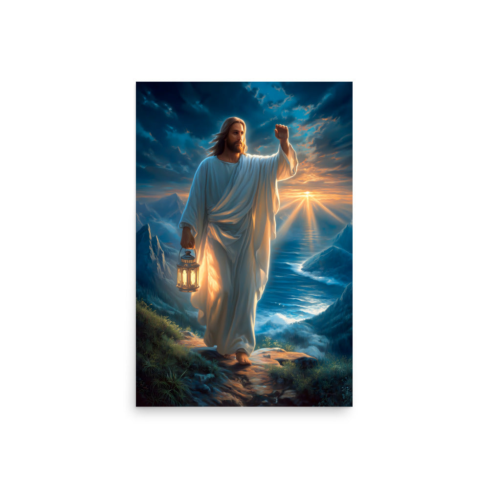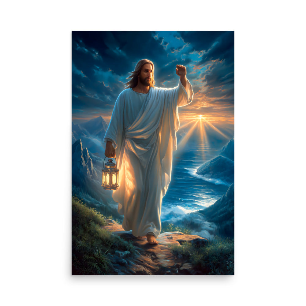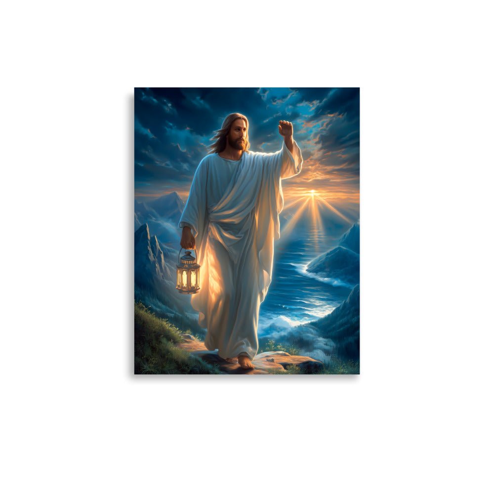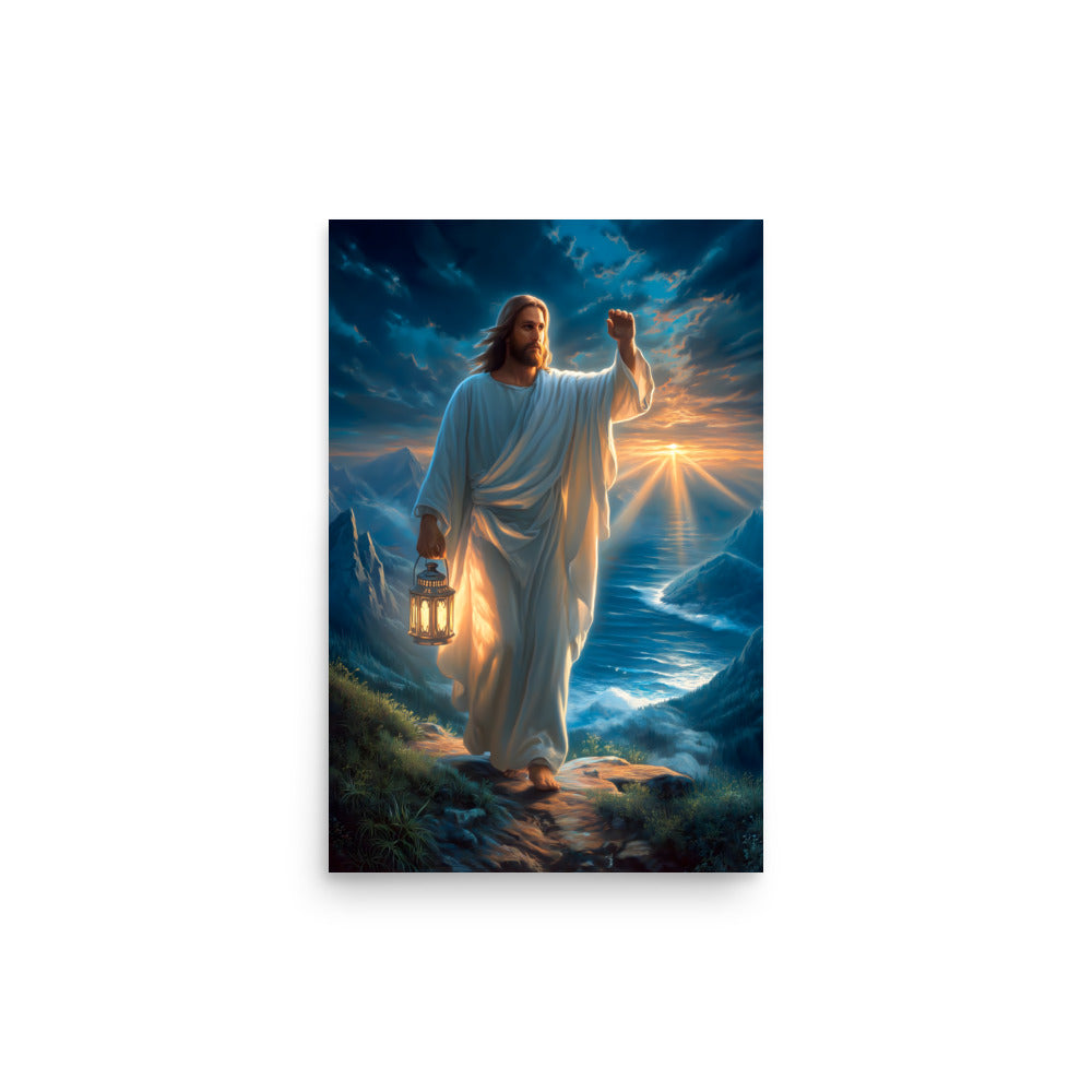 Bring courage, guidance, and steadfast hope into your space with this radiant, museum-quality artwork portraying Jesus Christ as the Light of the World, walking forward along a rugged mountain path as dawn breaks across the sea. In one hand He carries a glowing lantern, its warm light illuminating each step ahead, while His other hand is raised with calm authority—an assurance of protection, direction, and divine presence. Stormy clouds swirl above, yet golden sunlight pierces the horizon, reflecting the promise that light always overcomes darkness.