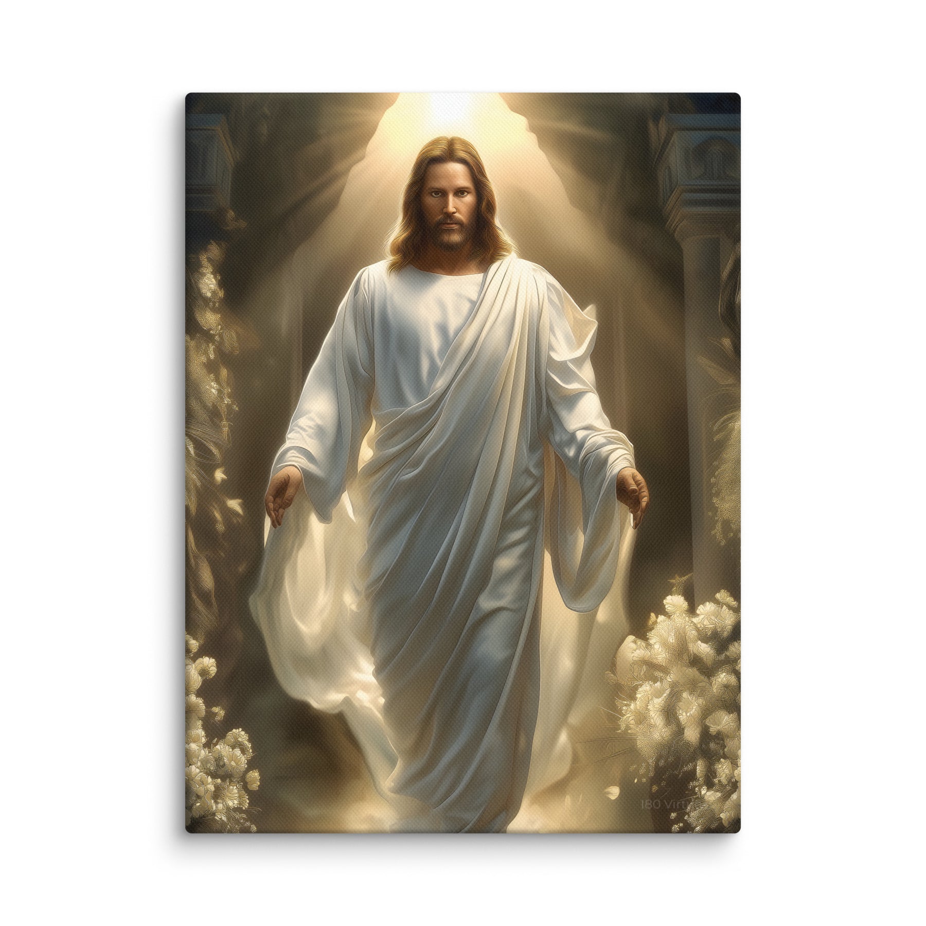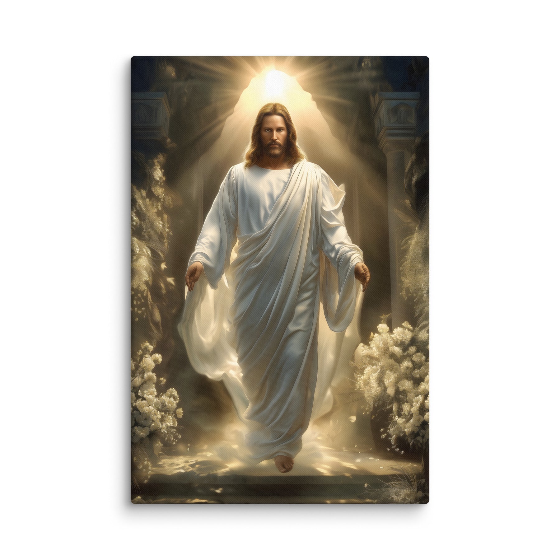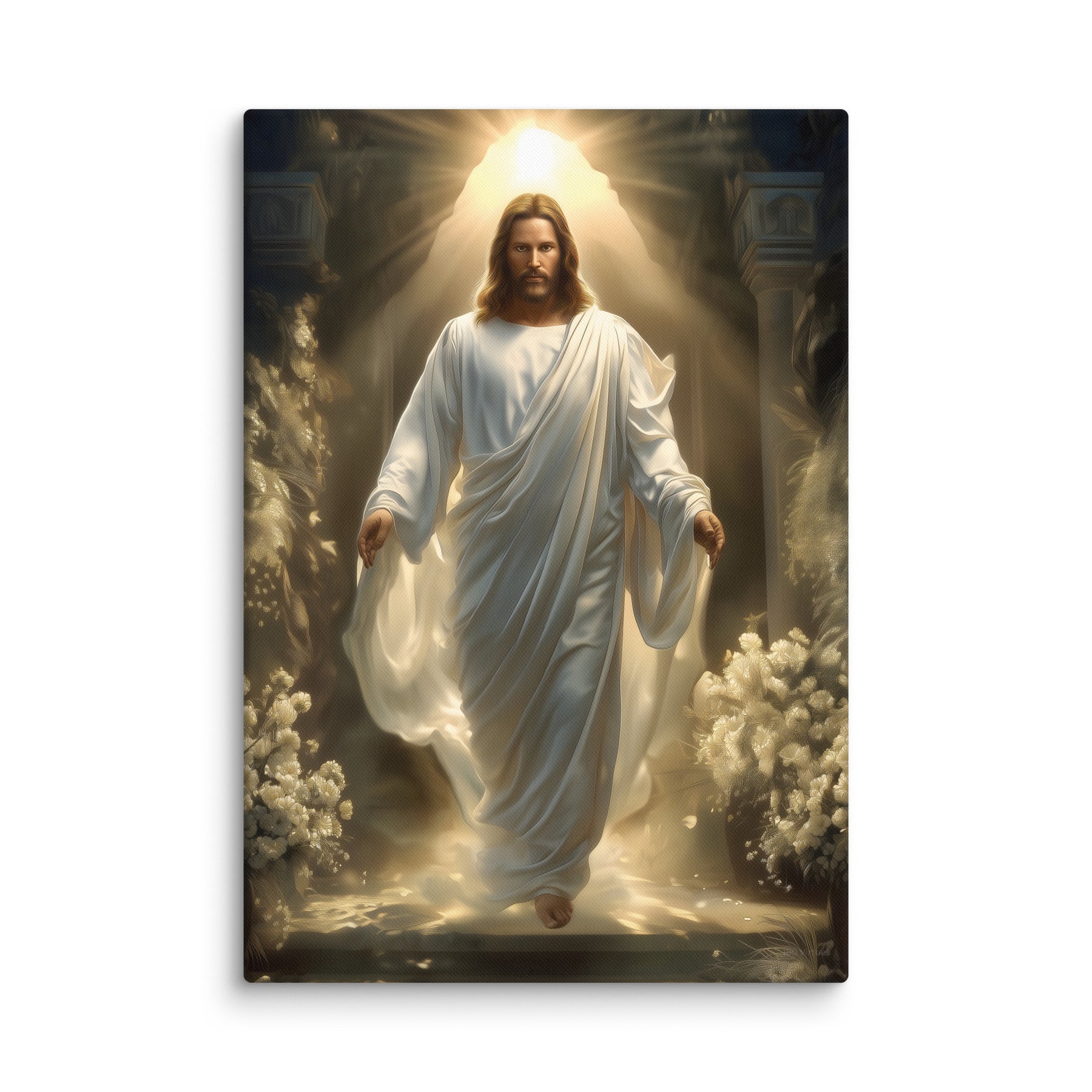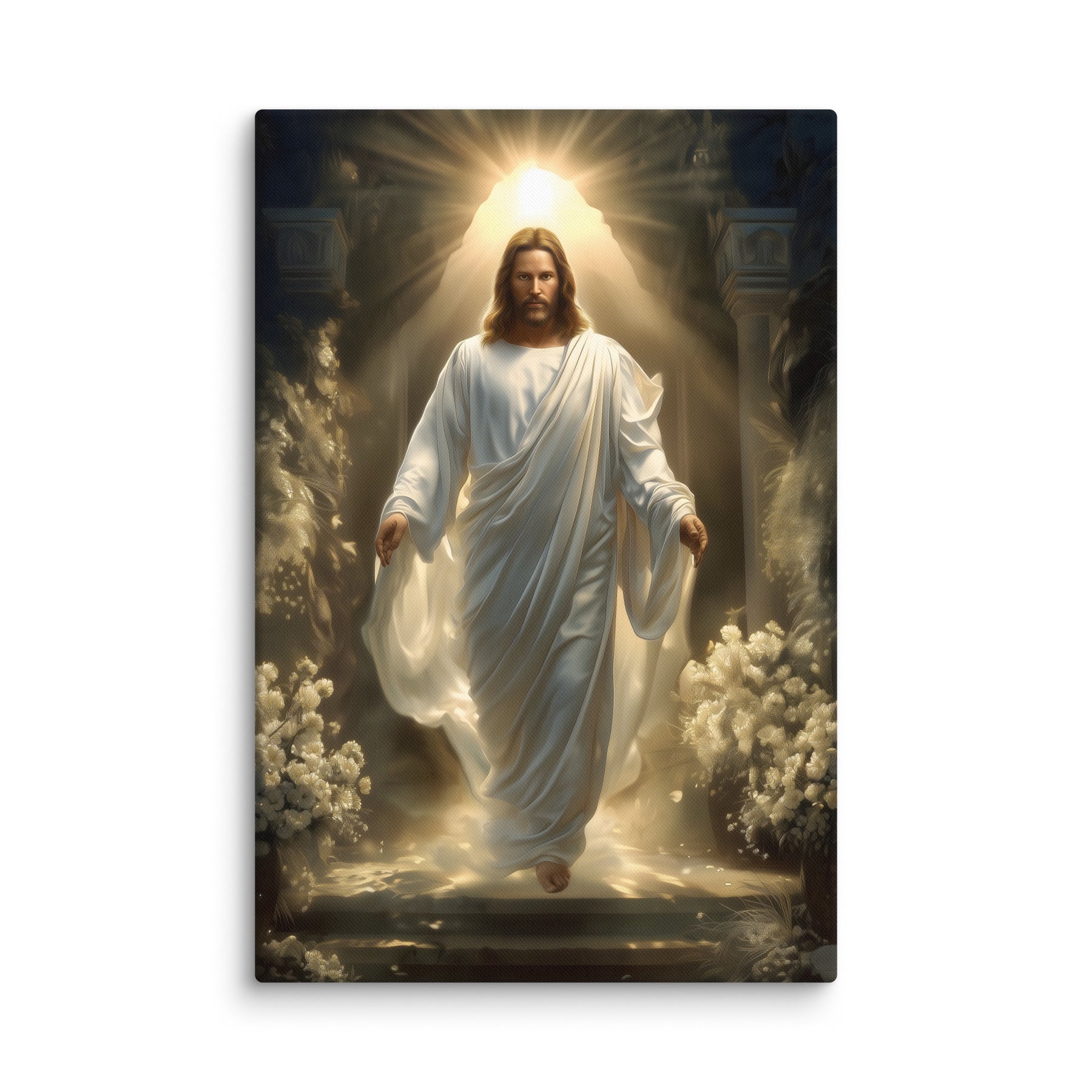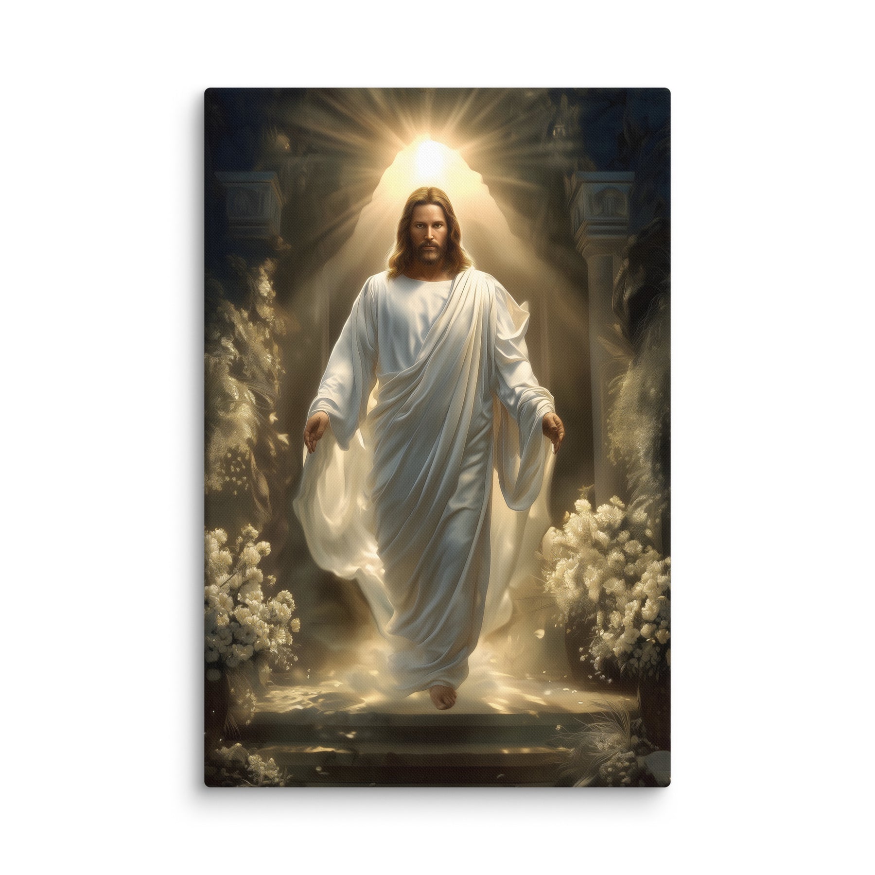 This masterpiece captures the very heart of Christianity: hope restored, promises fulfilled, and a Savior who lives. Every detail—from the stone steps beneath His feet to the shimmering petals in the air—creates a breathtaking sense of awe and reverence. Perfect for Christian homes, church foyers, sanctuaries, prayer rooms, and Easter displays, this canvas transforms any space into a reminder of Christ’s living presence and everlasting grace.