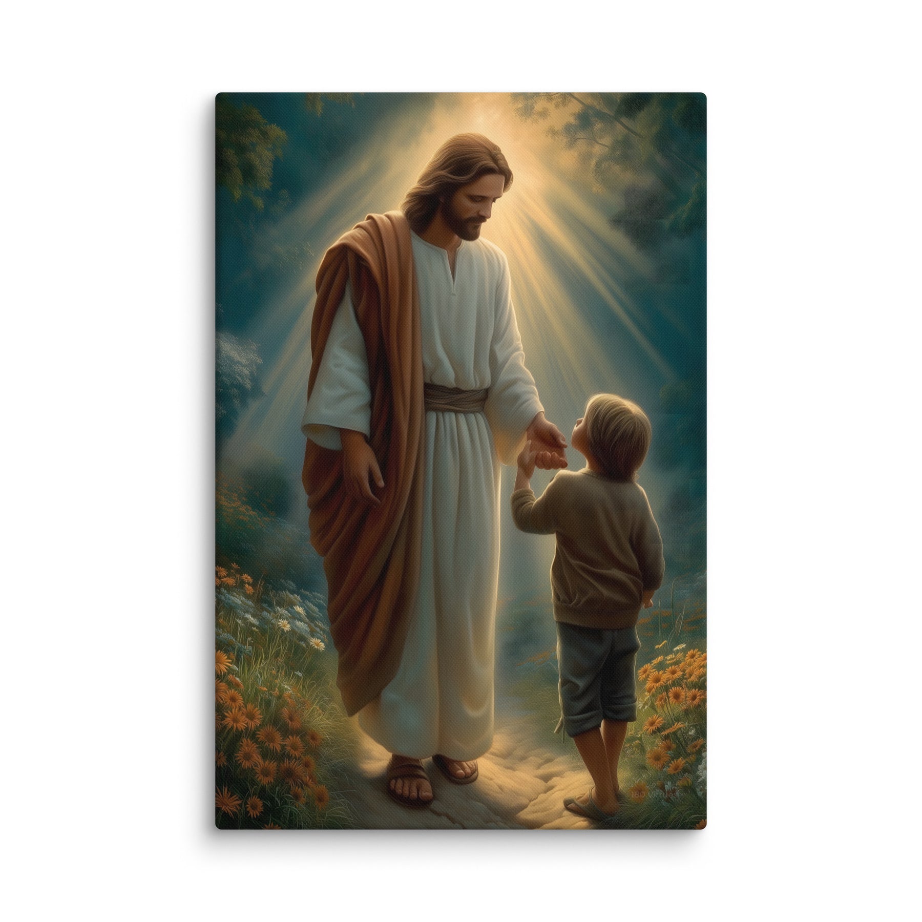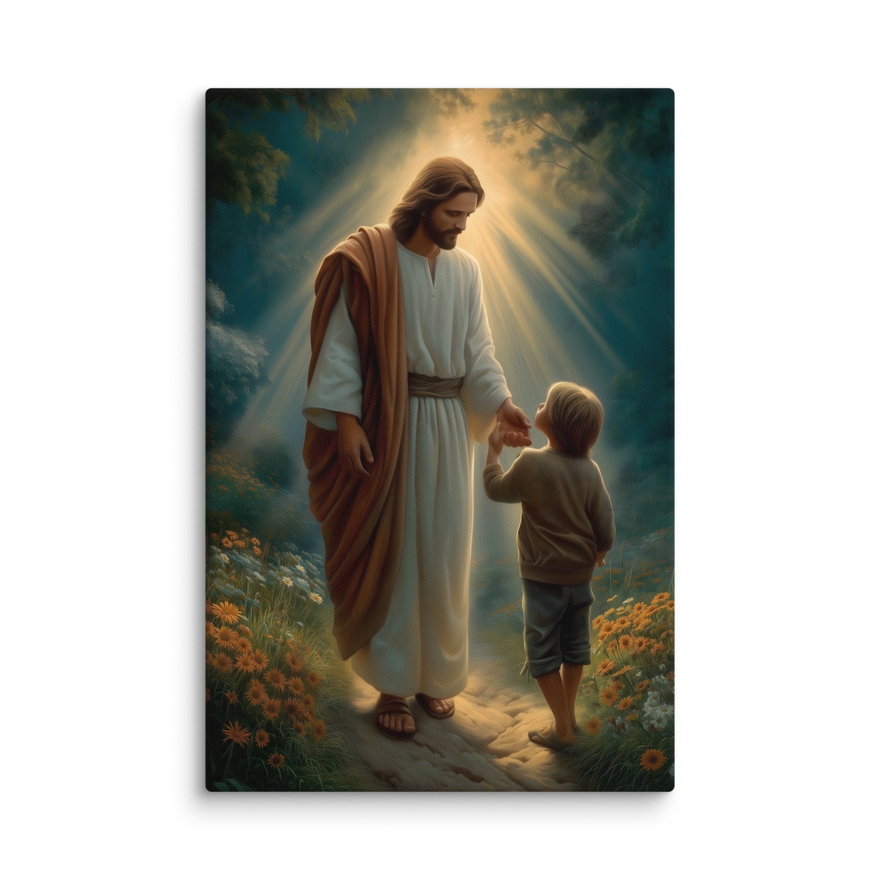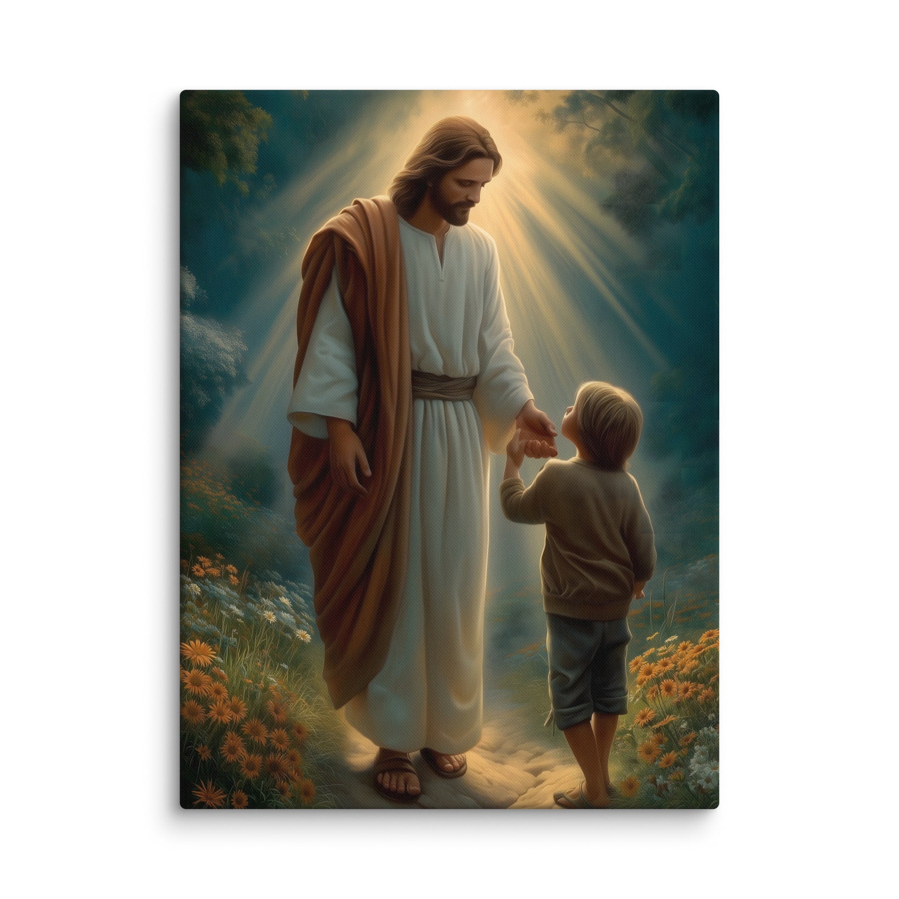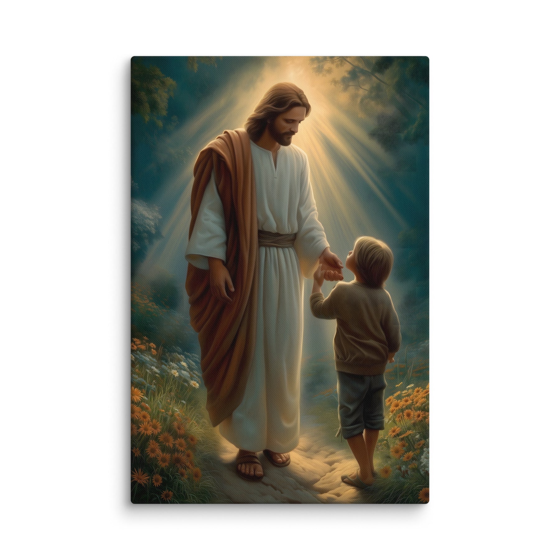 This gentle scene captures a sacred moment of trust as Jesus reaches out to a young child, inviting him forward along a softly lit path. Warm rays of heavenly light surround them, symbolizing divine guidance, protection, and the quiet reassurance that comes from walking hand in hand with the Savior. The child’s small step forward reflects faith, innocence, and the courage that grows when love leads the way.