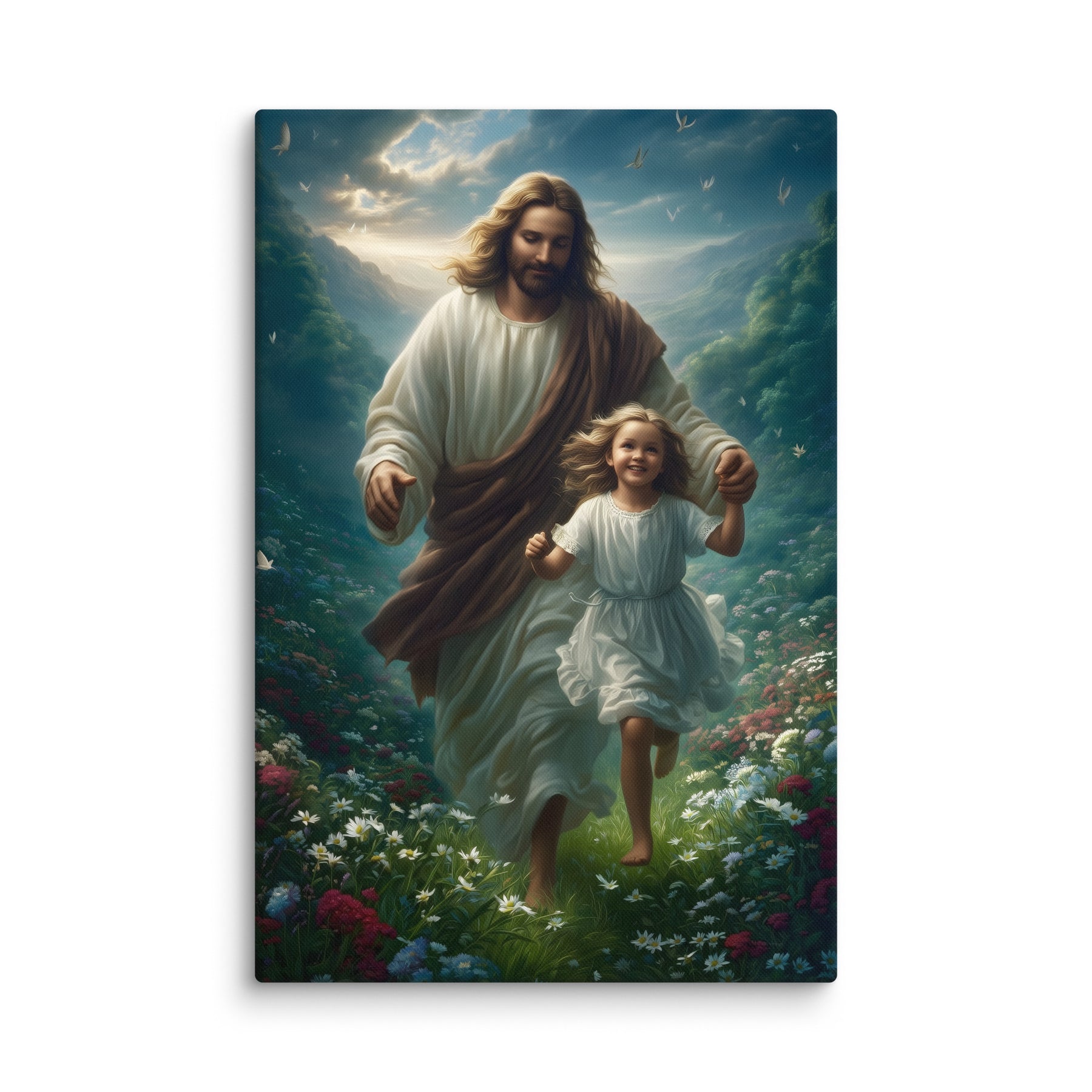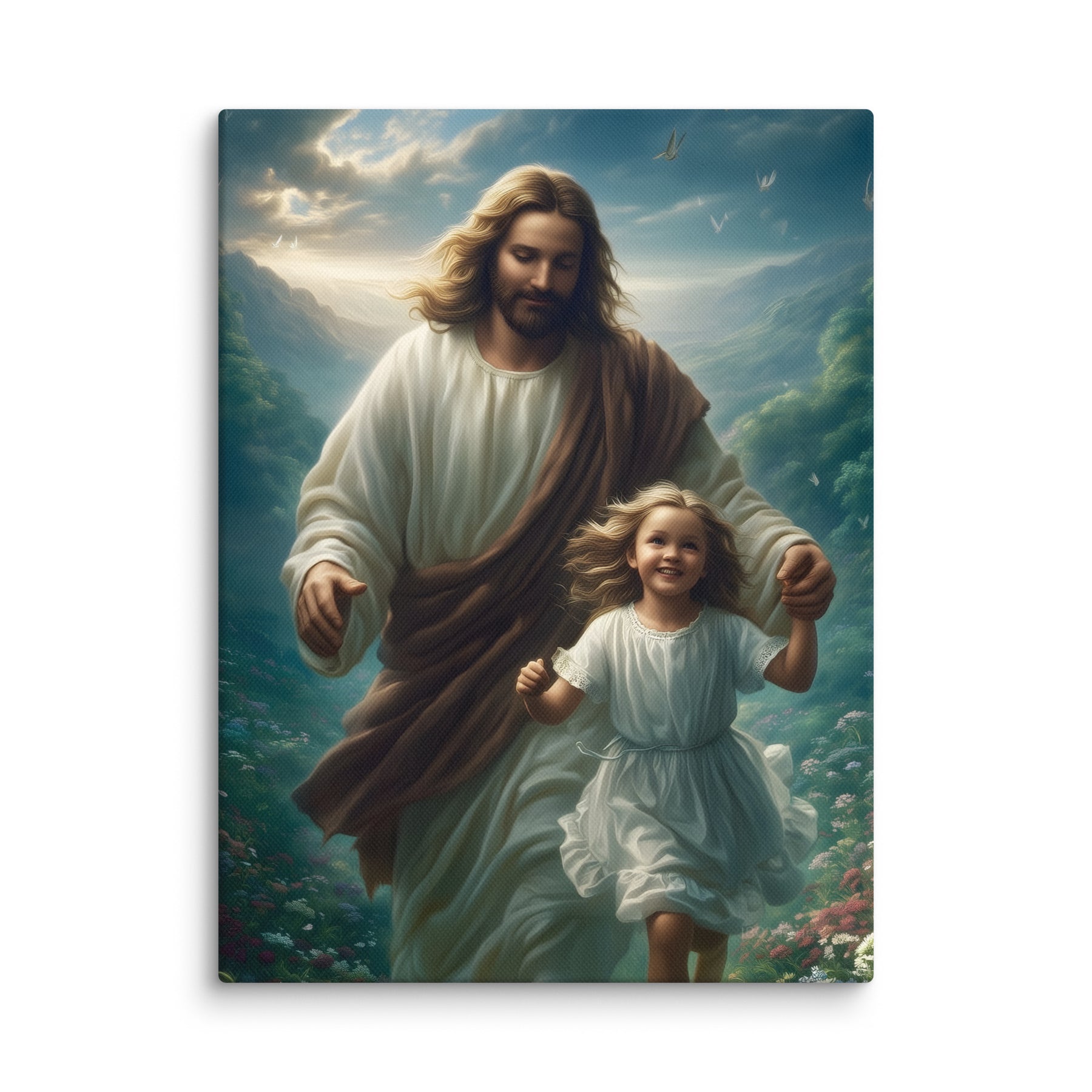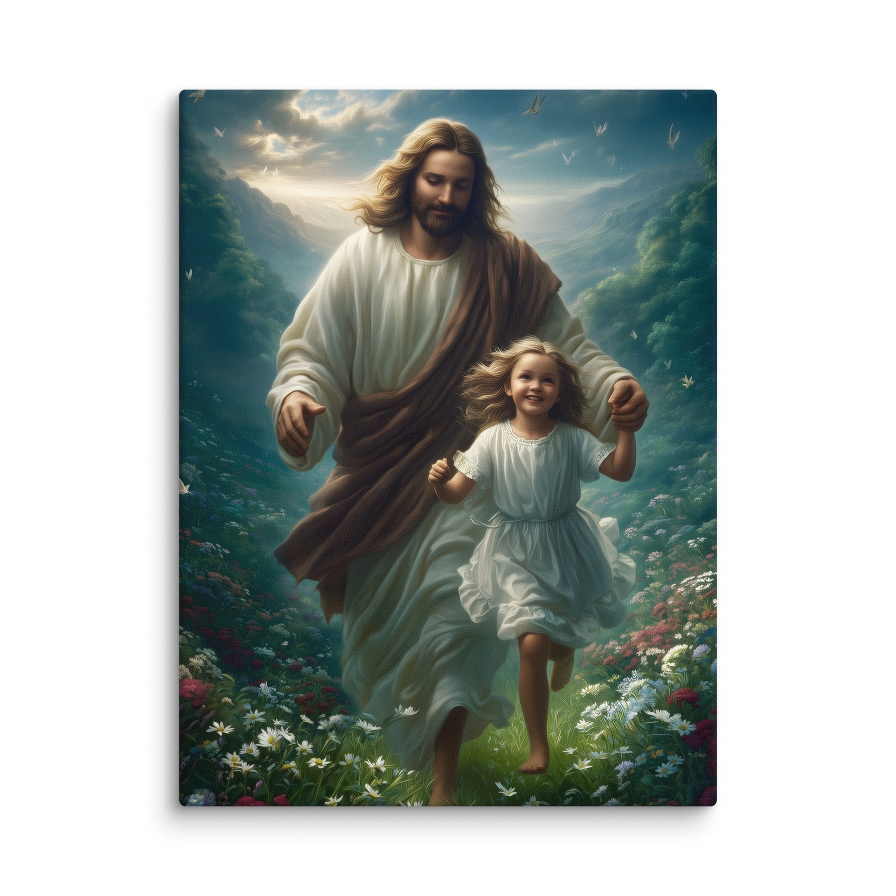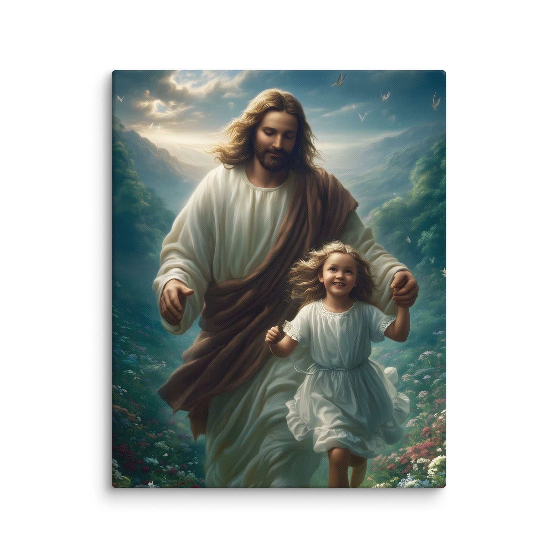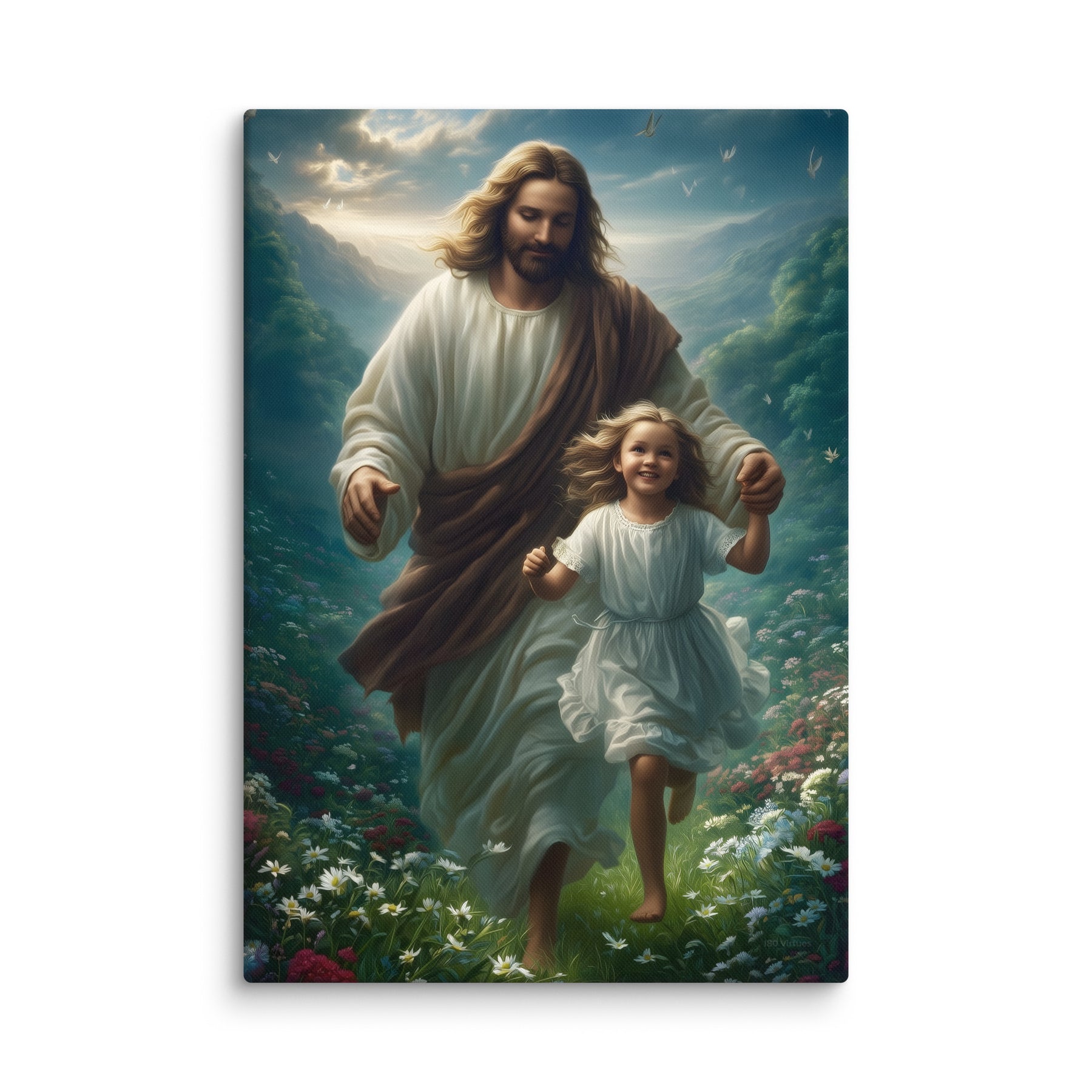 Hand in hand, Jesus walks joyfully beside a little girl, her laughter carried on the breeze as flowers bloom along their path. In this moment of pure delight, His presence turns every step into a blessing, every movement into a reminder that childhood wonder is cherished by heaven. The girl runs freely, confident and unafraid, knowing she is guided by love that never falters.