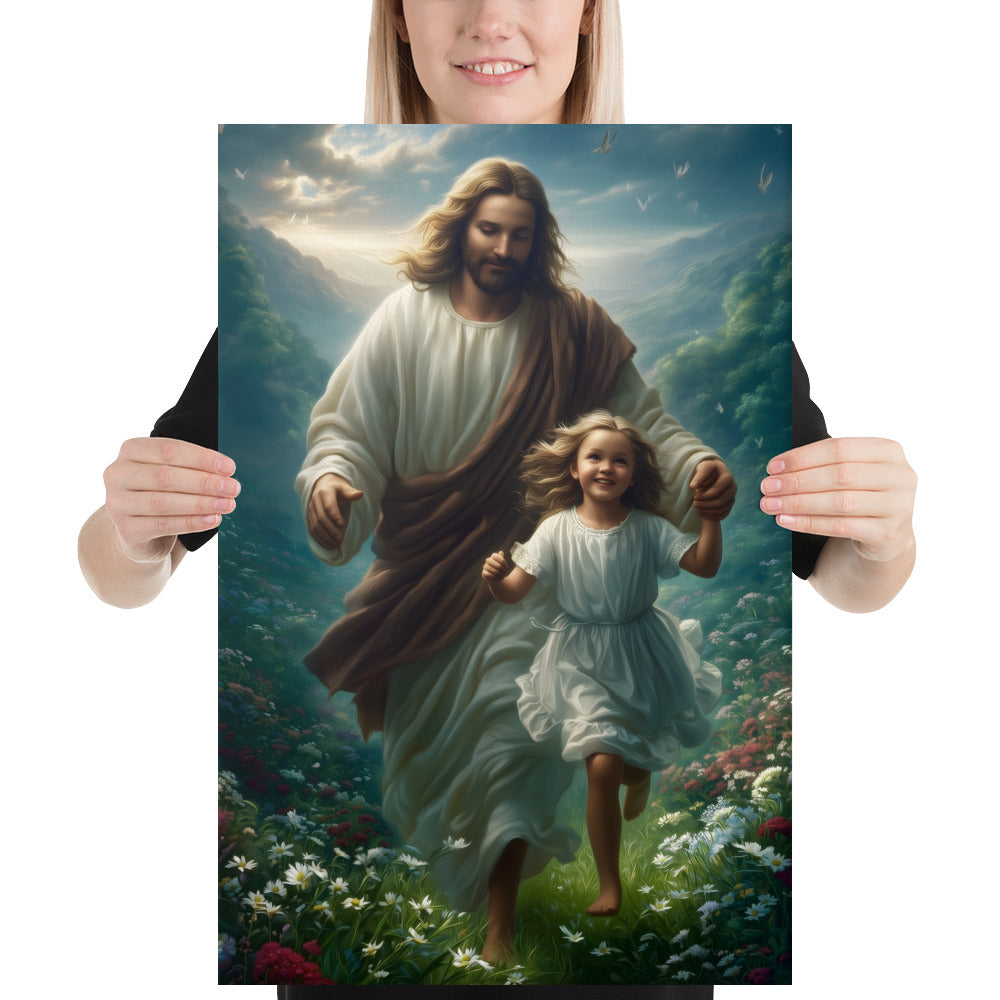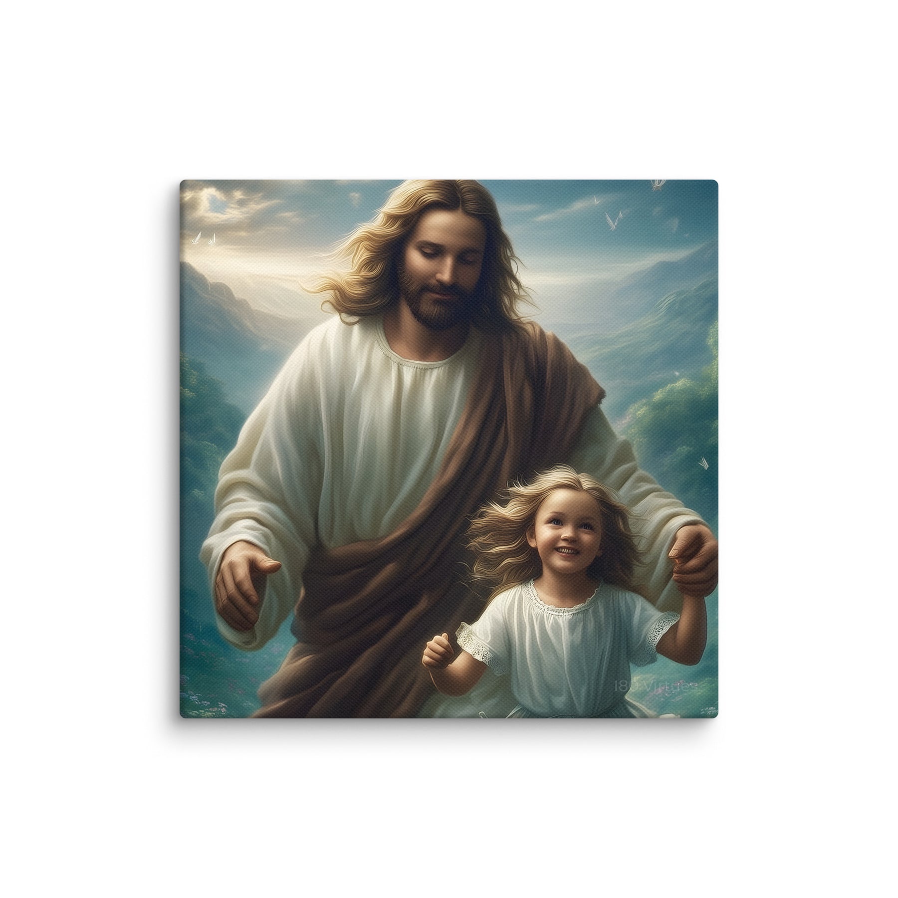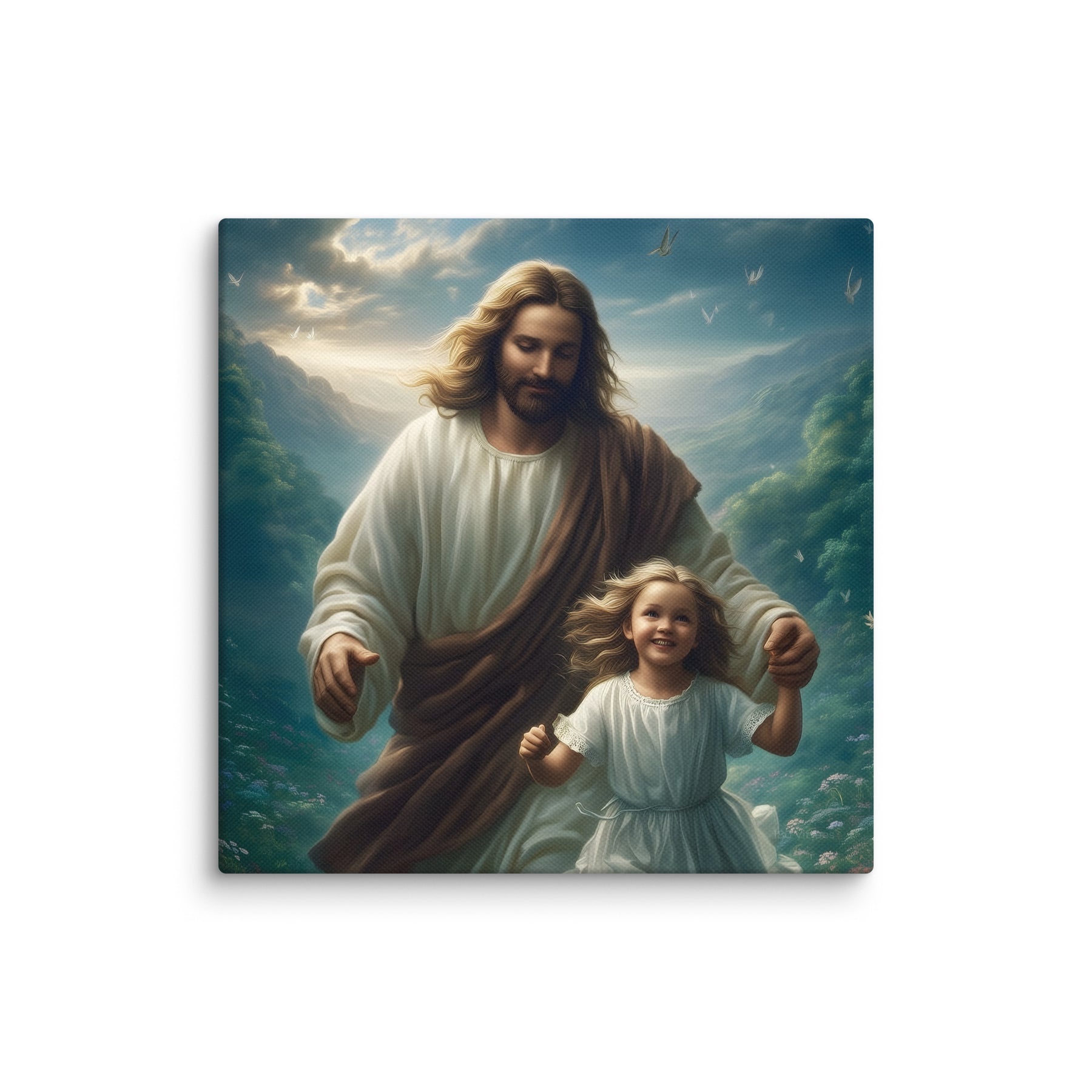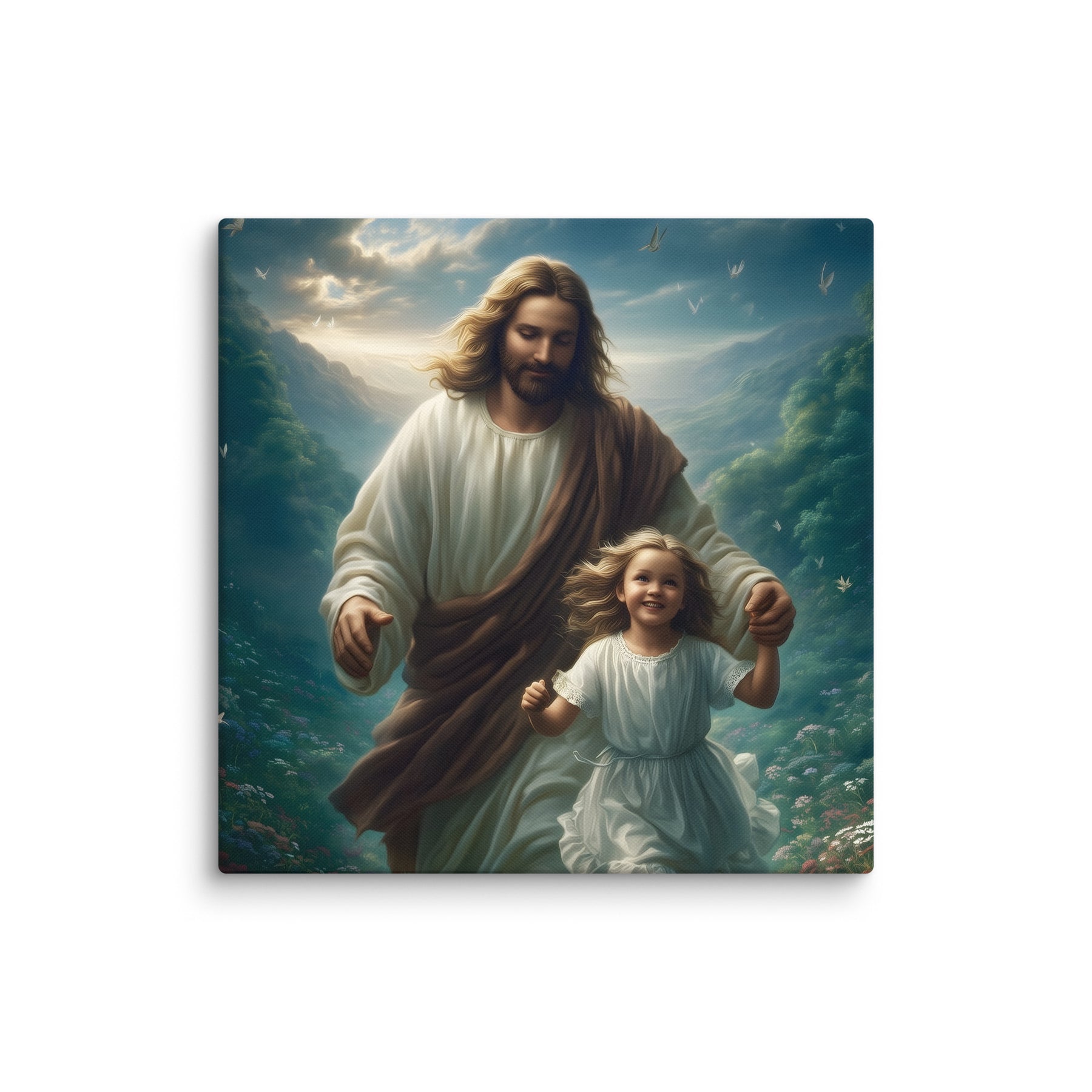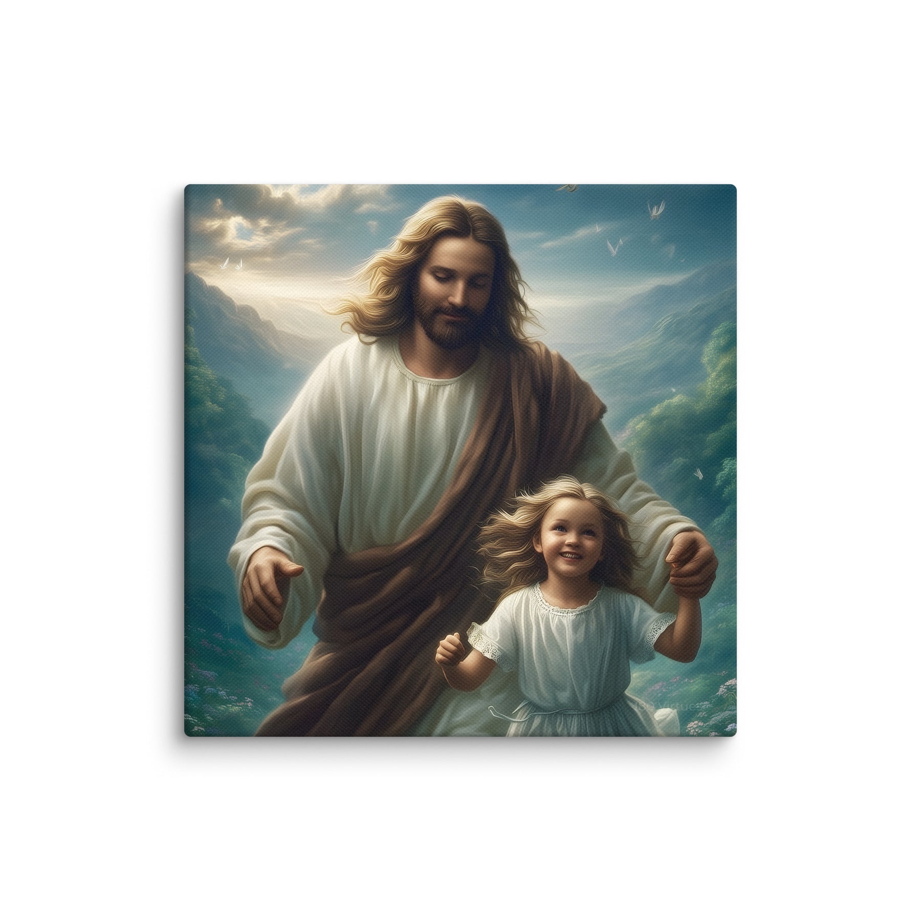 Hand in hand, Jesus walks joyfully beside a little girl, her laughter carried on the breeze as flowers bloom along their path. In this moment of pure delight, His presence turns every step into a blessing, every movement into a reminder that childhood wonder is cherished by heaven. The girl runs freely, confident and unafraid, knowing she is guided by love that never falters.